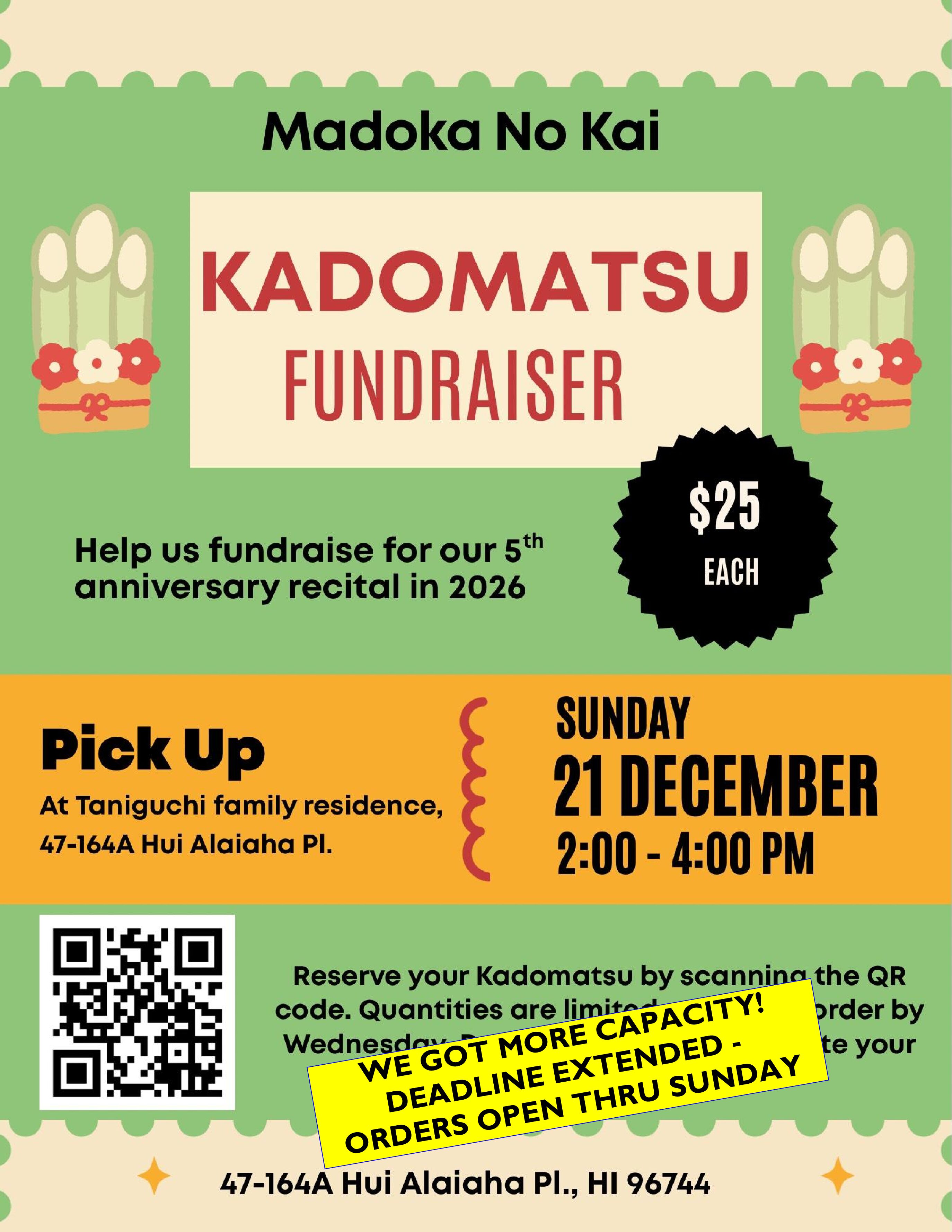 The Madoka No Kai Hawaiʻi Chapter is fundraising for its 5th Anniversary Recital. Kodomatsu are available for $25 each and can be ordered through Sunday, December 21, 2025. View the event details to place your order!