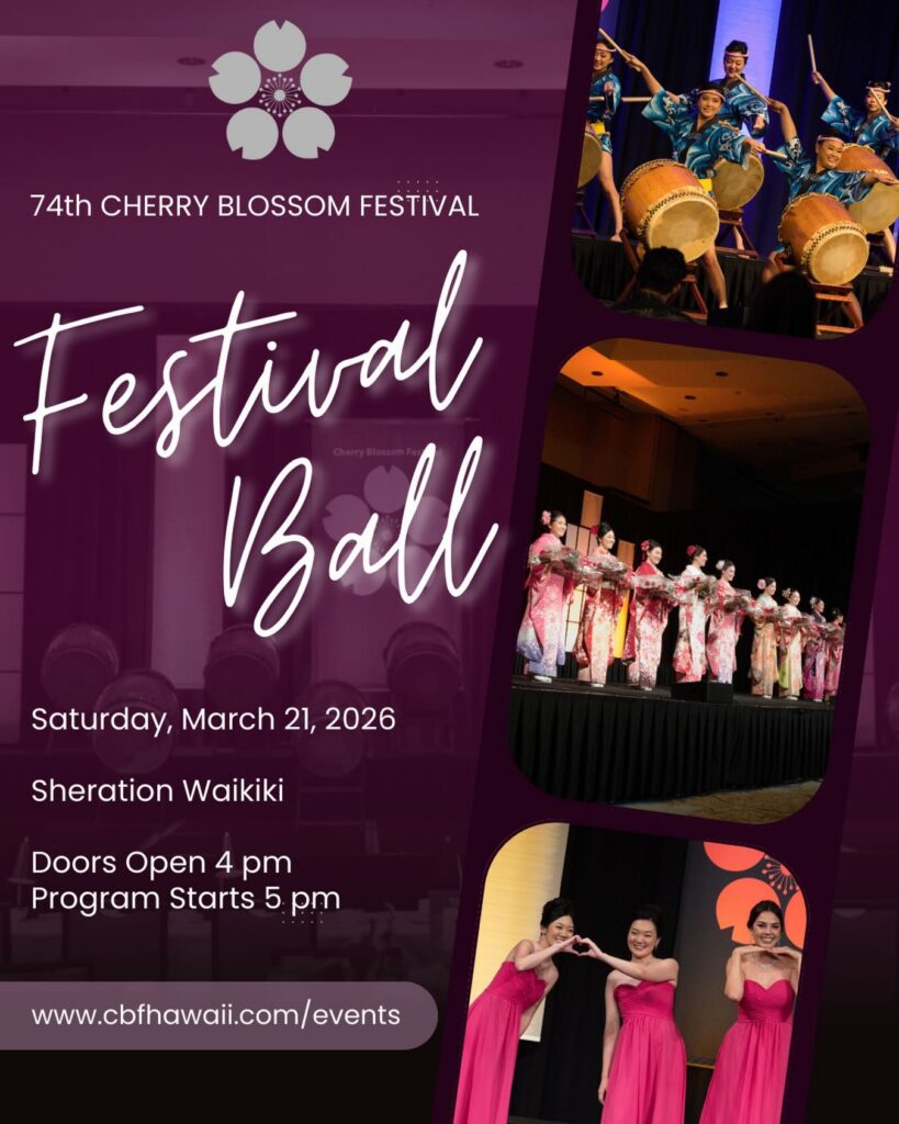 The 74th Cherry Blossom Festival Ball features the Cherry Blossom Festival Queen contestants as they present what they’ve learned throughout the program. The evening includes a taiko performance, self-composed speeches during the Western phase, and a furisode kimono presentation during the Eastern phase. The program concludes with the coronation of the 74th Cherry Blossom Festival Queen and Court, and guests can also enjoy a silent auction.