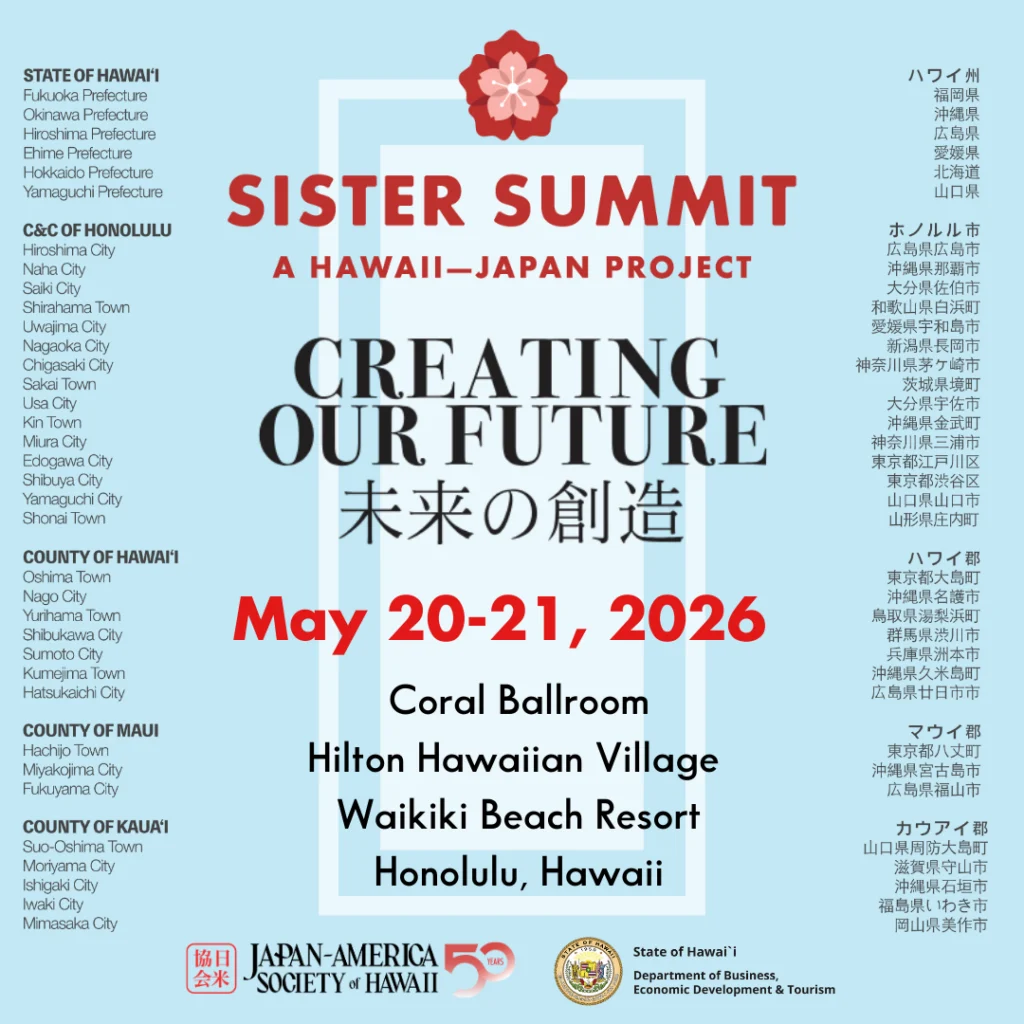 Hawai’i and Japan come together once again for a landmark gathering of leaders, innovators, and changemakers when we convene the 2026 Hawai’i–Japan Sister State and Sister City Summit, which will include a Hawai’i–Japan Economic Policy Forum. Building on the extraordinary success of the inaugural 2023 Summit—the largest Hawai’i–Japan international convening in more than two decades—this next chapter promises even greater impact.